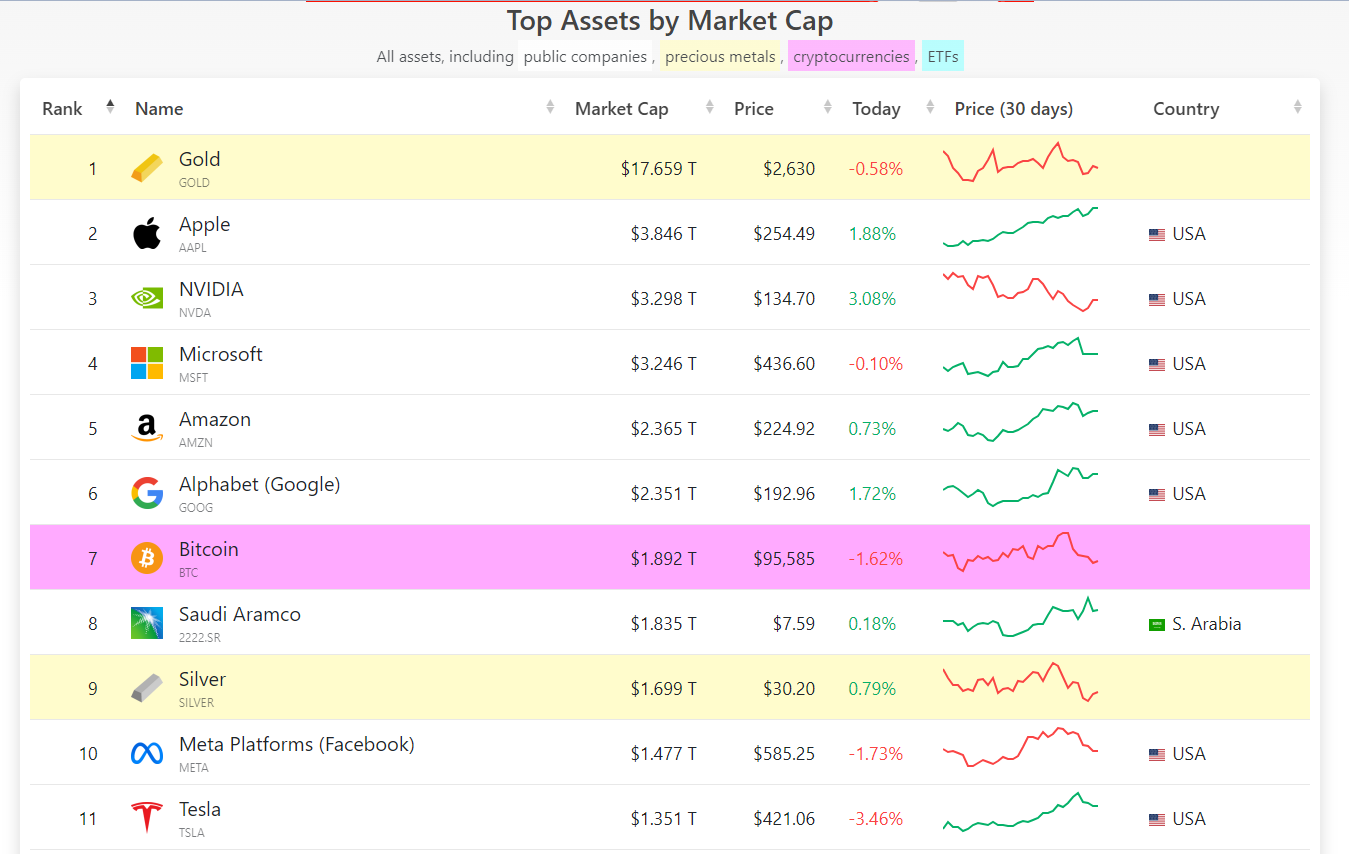 첨부된 이미지에 따르면, Top Assets by Market Cap은 글로벌 자산(귀금속, 대형 기술 기업, 암호화폐 등)을 시가총액 기준으로 나열한 순위입니다. 이 랭킹은 자산의 현재 가치를 반영하며, 글로벌 시장에서 해당 자산의 중요성을 보여줍니다.