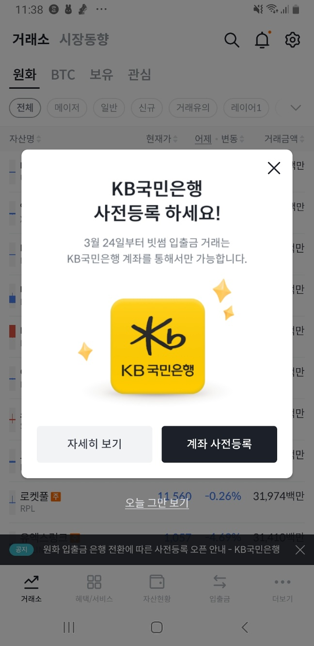 - 사전등록을 하지 않으면 3월 24일 이후 원화 입출금 및 원화 마켓 거래가 불가능할 수 있습니다.