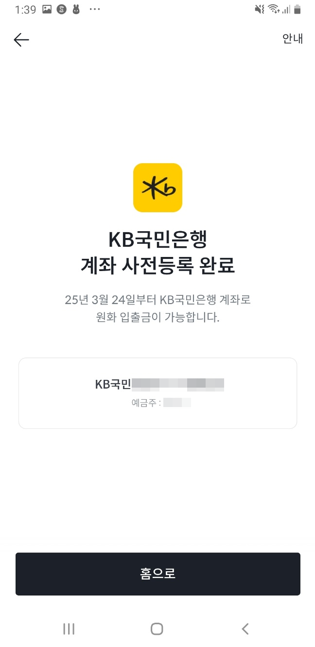 - 계좌 등록이 정상적으로 완료되면, 빗썸에서 등록 완료 메시지를 받습니다.