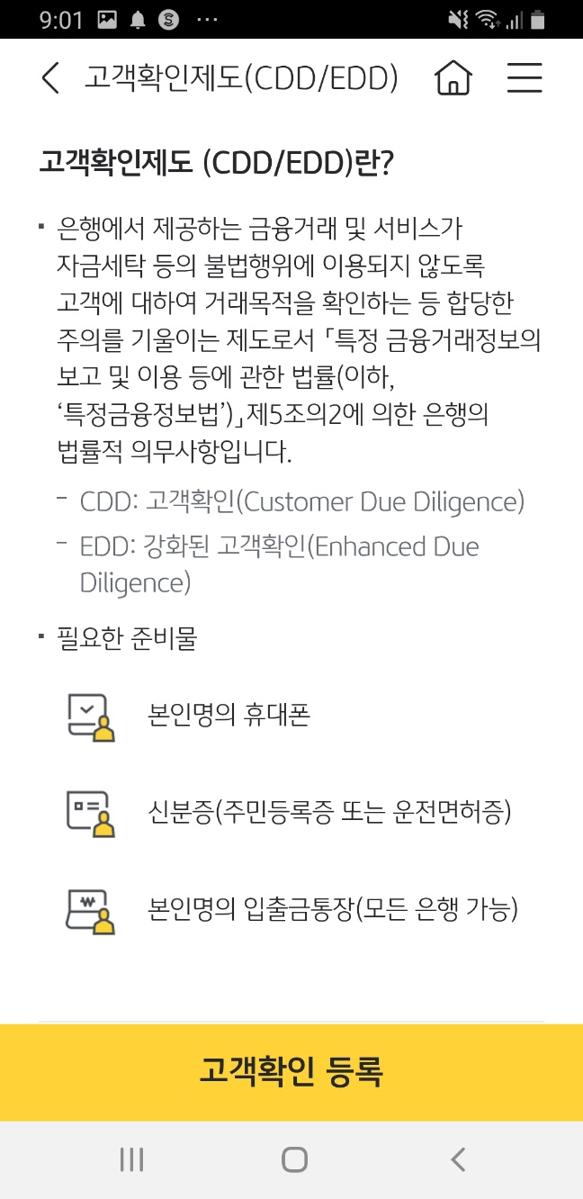 - 신분증 인증화면은 스샷이 안되는 관계로 마무리만 찍었습다. CDD/EDD 등록완료되면 다시 4번으로 가게 됩니다.