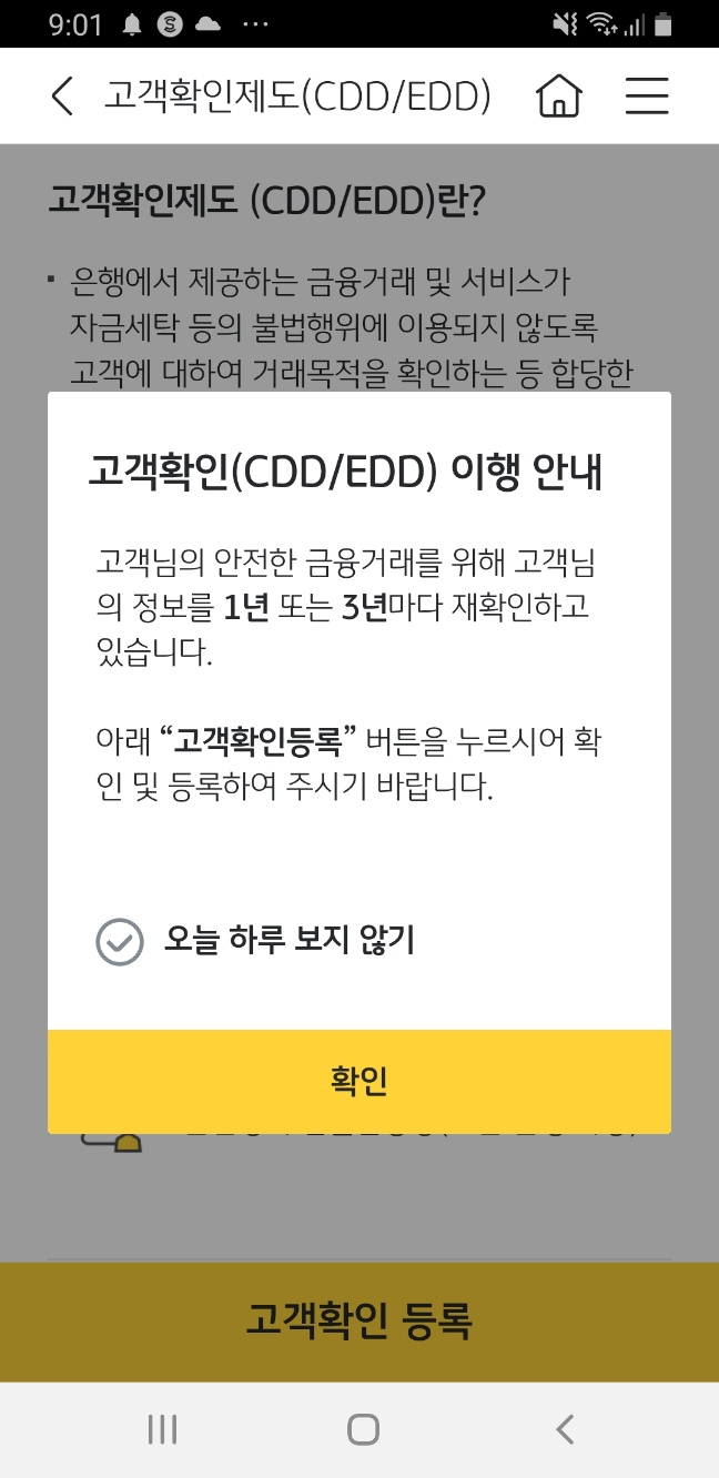 - 고객확인제도는 완료하면 24시간 유효하고 24시간이 지나면 다시 받아야 합니다.