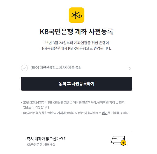 빗썸의 원화 입출금 은행이 KB국민은행으로 변경됨에 따라 사전등록이 필수입니다. 위의 단계를 따라 핸드폰이나 PC에서 간단히 계좌를 등록하고, 원활한 거래를 준비하세요! 또한, 사전등록 이벤트도 함께 참여하여 추가 혜택을 받아보시기 바랍니다.
