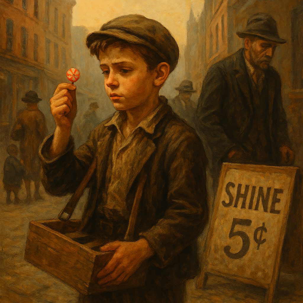 그는 부자 신사의 구두를 닦고, 하루에 단 몇 센트를 벌었다.