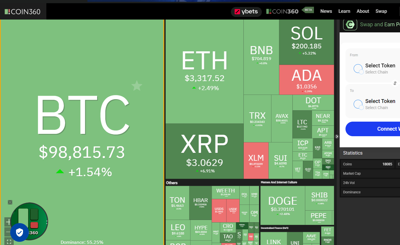 Coin360은 실시간 암호화폐 시장 데이터를 시각적으로 제공하는 플랫폼으로, 다양한 암호화폐의 가격, 시가총액, 거래량, 시장 점유율 등을 한눈에 확인할 수 있습니다. 트리맵(Treemap) 형태의 인터페이스를 제공하여, 코인의 가격 변동을 색상과 크기로 직관적으로 분석할 수 있는 강력한 도구입니다.